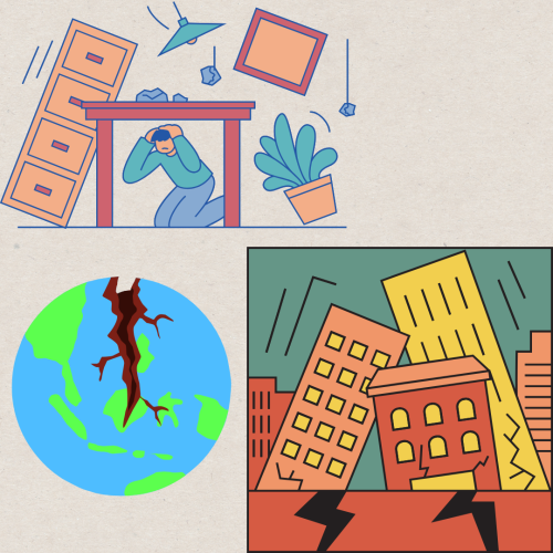 Saat terjadi gempa bumi, sebaiknya mencari tempat yang aman seperti di bawah meja atau di luar bangunan.